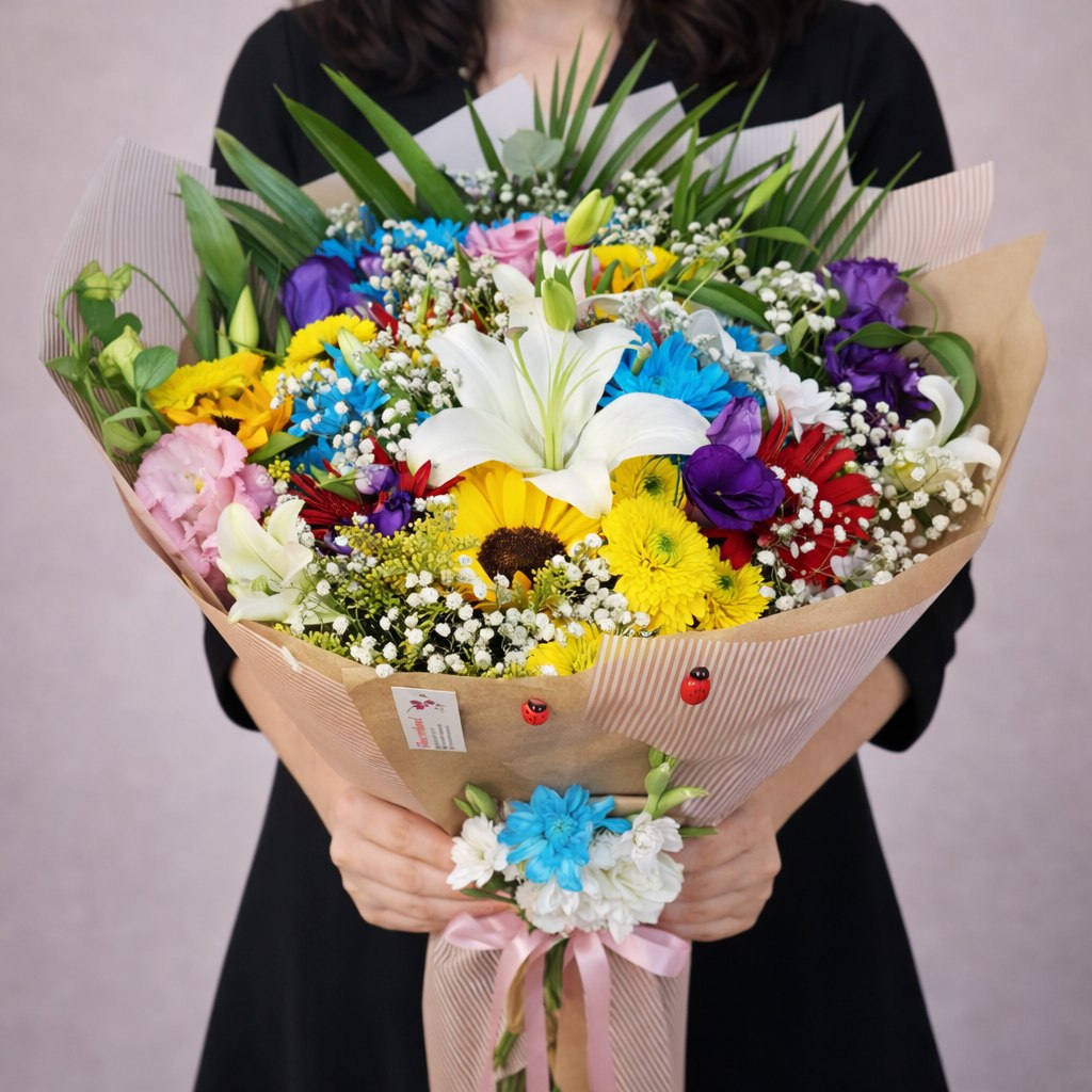 Renkli Neşe Buketi, lilyumun zarafeti ve ayçiçeğinin enerjisini bir araya getiriyor. Bu özel buket, beyaz lilyum, sarı ayçiçeği, mavi ve mor eustoma, kırmızı karanfil ve beyaz papatya ile harmanlanarak, göz alıcı bir renk cümbüşü sunuyor. 🌹💐